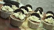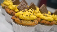 Den Ofen auf 210 Grad Umluft vorheizen. Die trockenen Zutaten, also Mehl und Backpulver in eine Rührschüssel geben und mit dem Knethaken kurz vermengen. Anschließend kommen die zimmerwarme Butter, die Milch und das Ei, welches du vorher kurz aufschlägst (verrührst), dazu. Nun in der Küchenmaschine zu einem gelen glatten Teig kneten. Alternativ natürlich mit dem Handrührgerät. Danach die Blaubeeren unterheben. Eine 12er Muffinform entweder mit Papierförmchen bestücken, oder wie hier einfetten. Nun die Förmchen zu 3/4 mit dem Teig befüllen. Jetzt die Kuvertüre mit einem scharfen Messer in etwa 1,5 mal 1,5 cm Größe stückeln und je ein Stück in die Mitte des Teiges drücken. Anschließend 20 bis 25 Minuten backen. Sie sollten leicht goldig sein. Alternativ, Stäbchenprobe machen. Nach dem Backen auskühlen lassen. Zeit, das Buttercreme Frosting zu bauen. Dazu ein Pack Puderzucker (250g) in eine Schüssel geben. Hinzu kommen 1 1/2 EL Wasser und das halbe Stück zimmerwarme Butter. Nun mit einem oder besser mehreren Zahnstochern ersteinmal 4 Farbstriche auf die Butter geben. Und abschliessend natürlich noch das Aroma. Das Ganze mit einer Gabel erst zerdrücken und dann zu einer recht festen Masse rühren. Bei Bedarf nachfärben. Ist dies geschehen, nimmst du einen Spritzbeutel oder eine Tortenspritze, bestückst das mit deiner Wunschtülle und verpasst den ausgekühlten Blaubeer Muffins eine schöne Haube. Bei Bedarf noch mit bunten Zuckerstreuseln bestreuen und servieren. Guten Appetit! |
